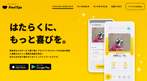 Fried Tips(フライドチップス)は”働く”にもっと喜びを感じ、飲⾷店などのサービス業で働くアルバイトやスタッフの賃⾦の問題や、感謝されにくい環境の問題を解決し、様々なお店での働きがいをつくっていくサービスです。Fried Tipsアプリを使いチップをオンライン上で渡せるサービスで、かんたんなシステムの導⼊だけでお客さまからいただいたチップをアルバイトやスタッフの給与として渡せます。アプリはiOS、Androidのプラットフォームに対応しております。