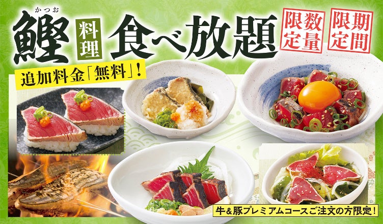食べ放題牛&豚プレミアムコース以上をご注文で、今が旬の炭火焼「鰹のたたき」などの鰹(かつお)料理が追加料金無料で食べ放題になります。(期間限定・数量限定です。)