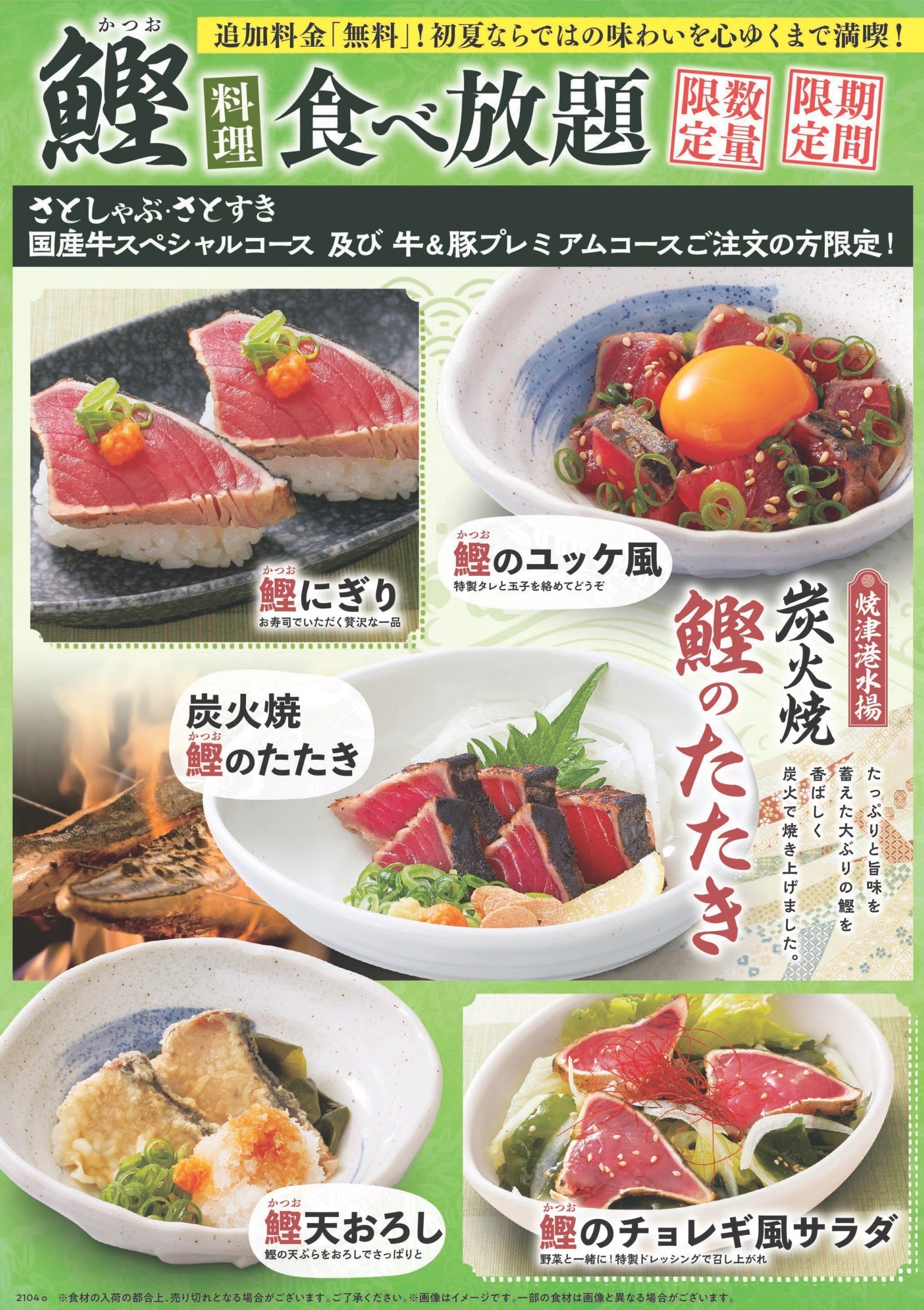 国内207店舗を展開する「和食さと」では、人気のしゃぶしゃぶ食べ放題「さとしゃぶ」の牛&豚プレミアムコース以上をご注文で、炭火焼「鰹のたたき」など5種類の鰹(かつお)料理が追加料金無料で食べ放題になるお得なイベントを5月9日(月)から開催します。