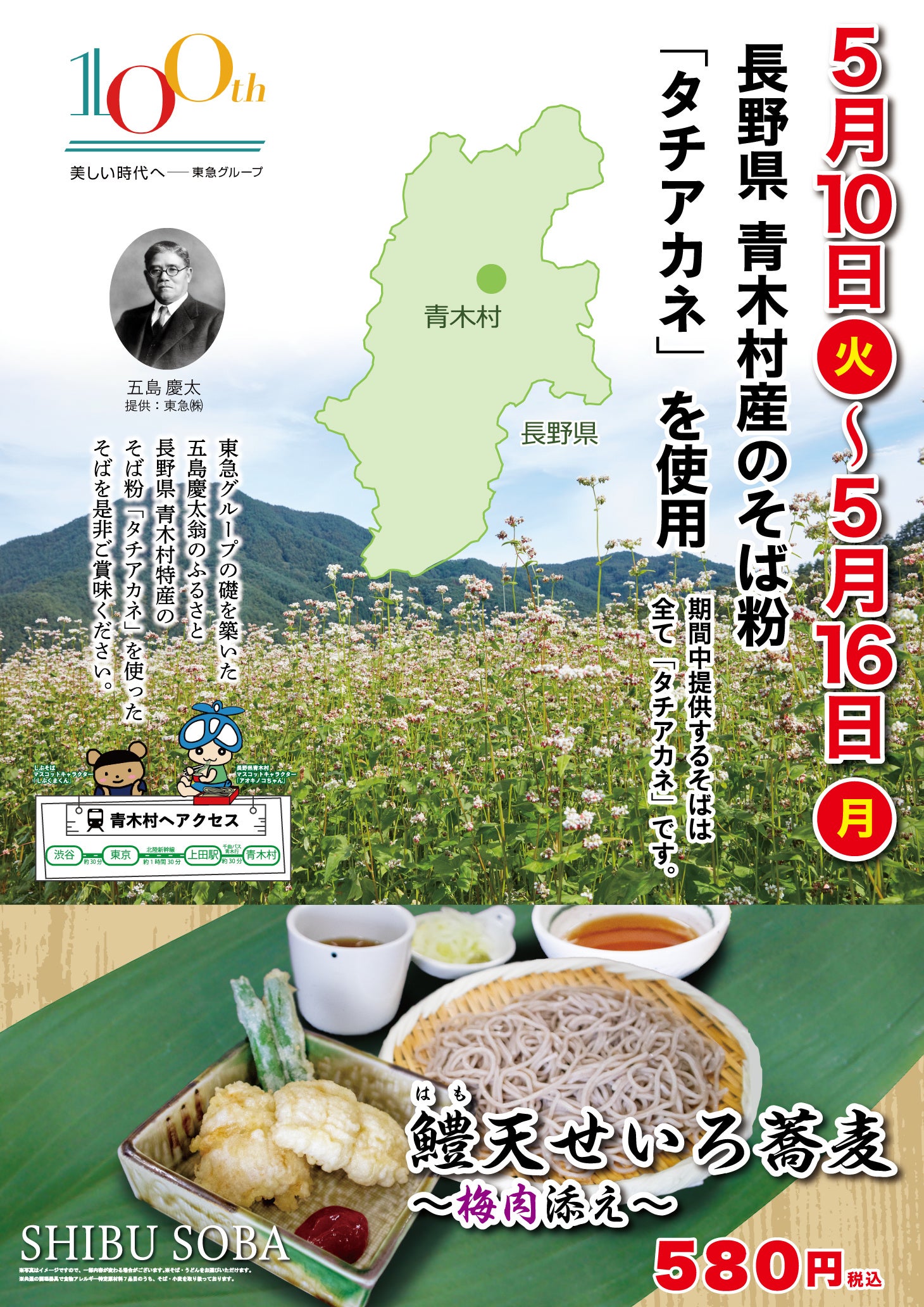 東急株式会社(以下、東急)の子会社である株式会社東急グルメフロント(以下、東急グルメフロント)は、長野県青木村(以下、青木村)と連携し、首都圏で14店舗を展開するそばチェーン「しぶそば」にて、長野県青木村産タチアカネそば粉を使用した「長野県青木村産タチアカネそばキャンペーン(以下、本キャンペーン)」を2022年5月10日から開始します。
