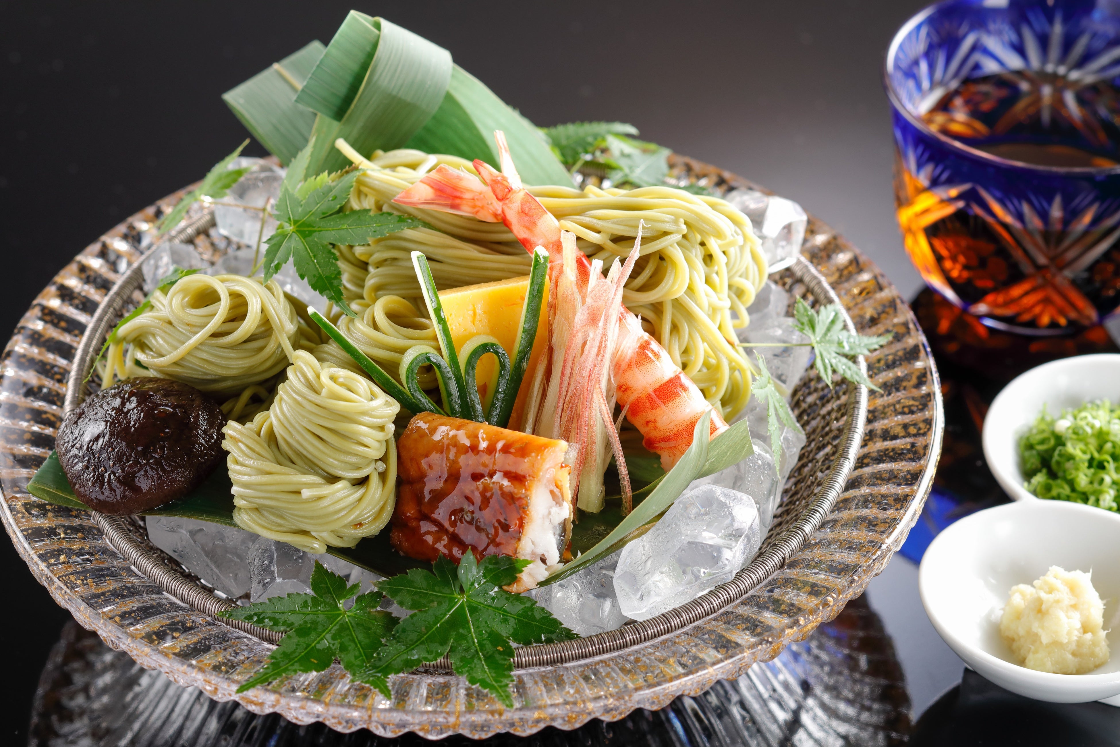 伊勢 かぶせ茶と三重県産の小麦を合わせた風味豊かな麺を、喉ごし爽やかな冷やしそうめんでお召し上がりいただきます。