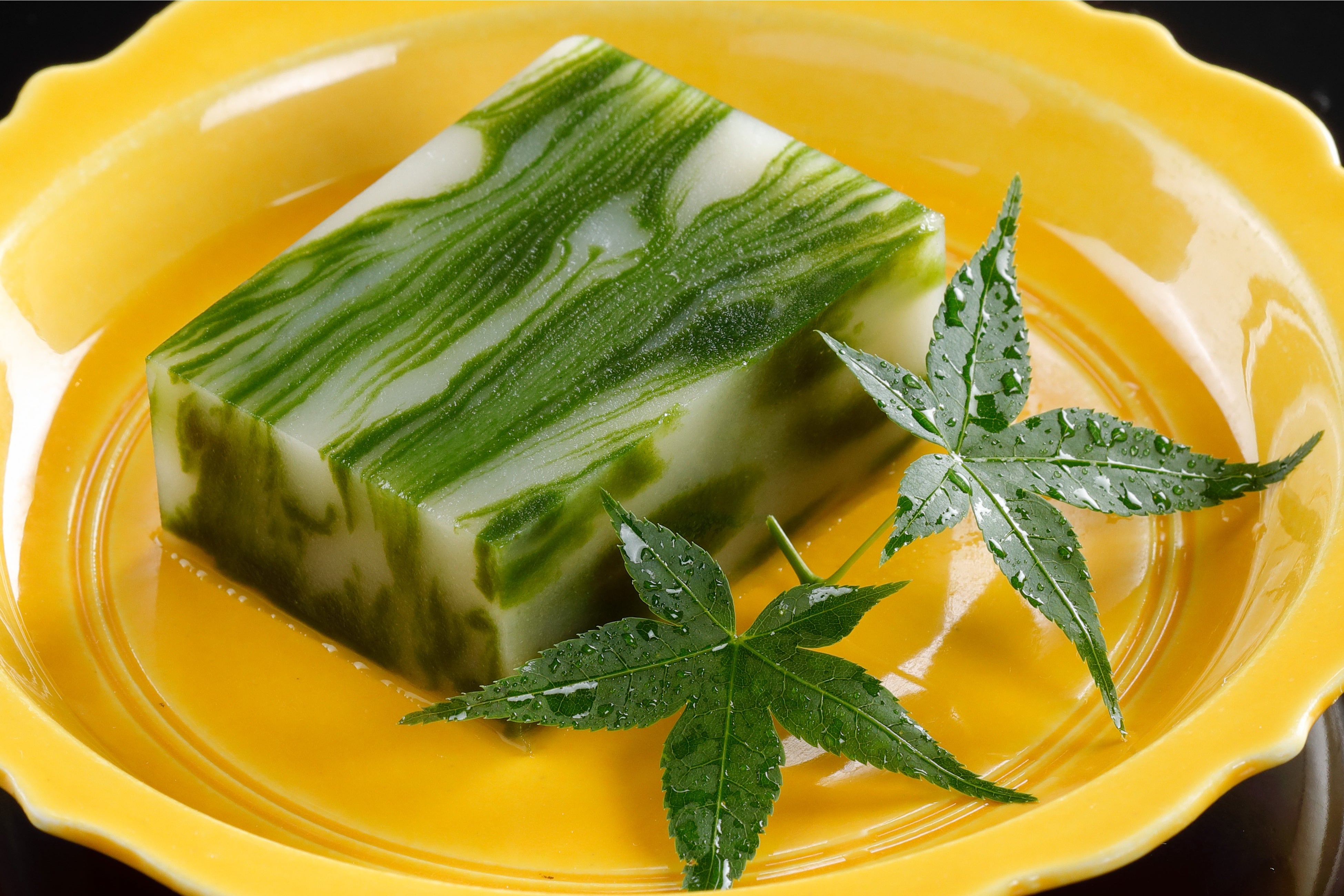 白こし餡と伊勢茶のペーストを墨流し模様に見立てた見た目も涼しげな水羊羹。伊勢茶の香味を堪能いただける、上品な甘さの和スイーツです。
