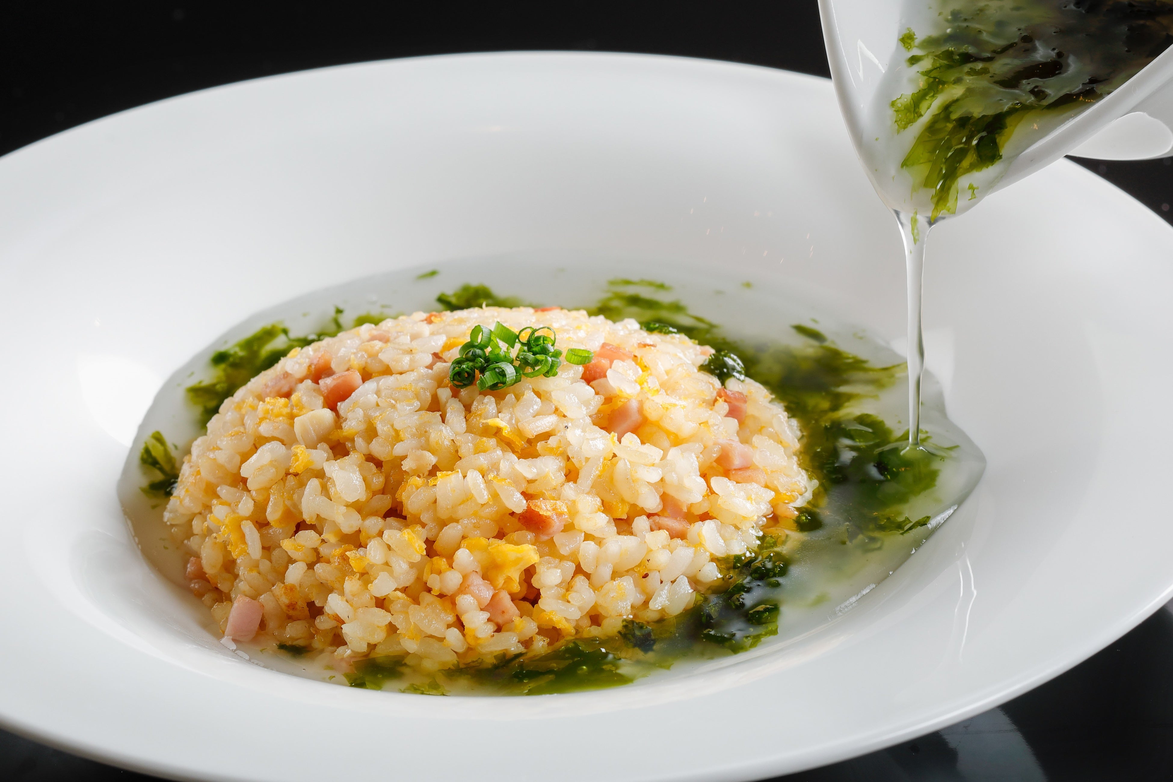 パラパラに仕上げた五目炒飯に風味豊かなあおさのりのあんかけをかけてお召し上がりいただきます。