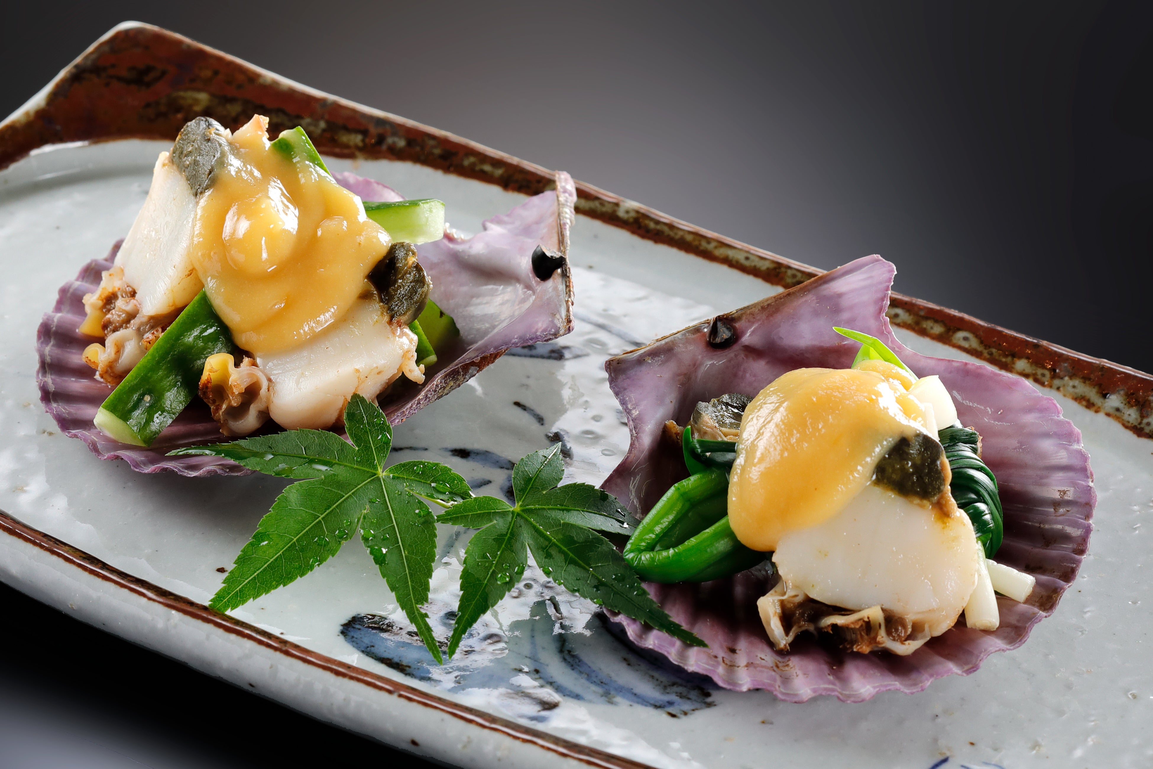 濃厚で甘みがある緋扇(ひおうぎ)貝をさっぱりとした酢味噌でお召し上がりいただきます。コリコリとした食感のヒモ、柔らかく旨みがある 貝柱と肝、葱の香りをご堪能ください。