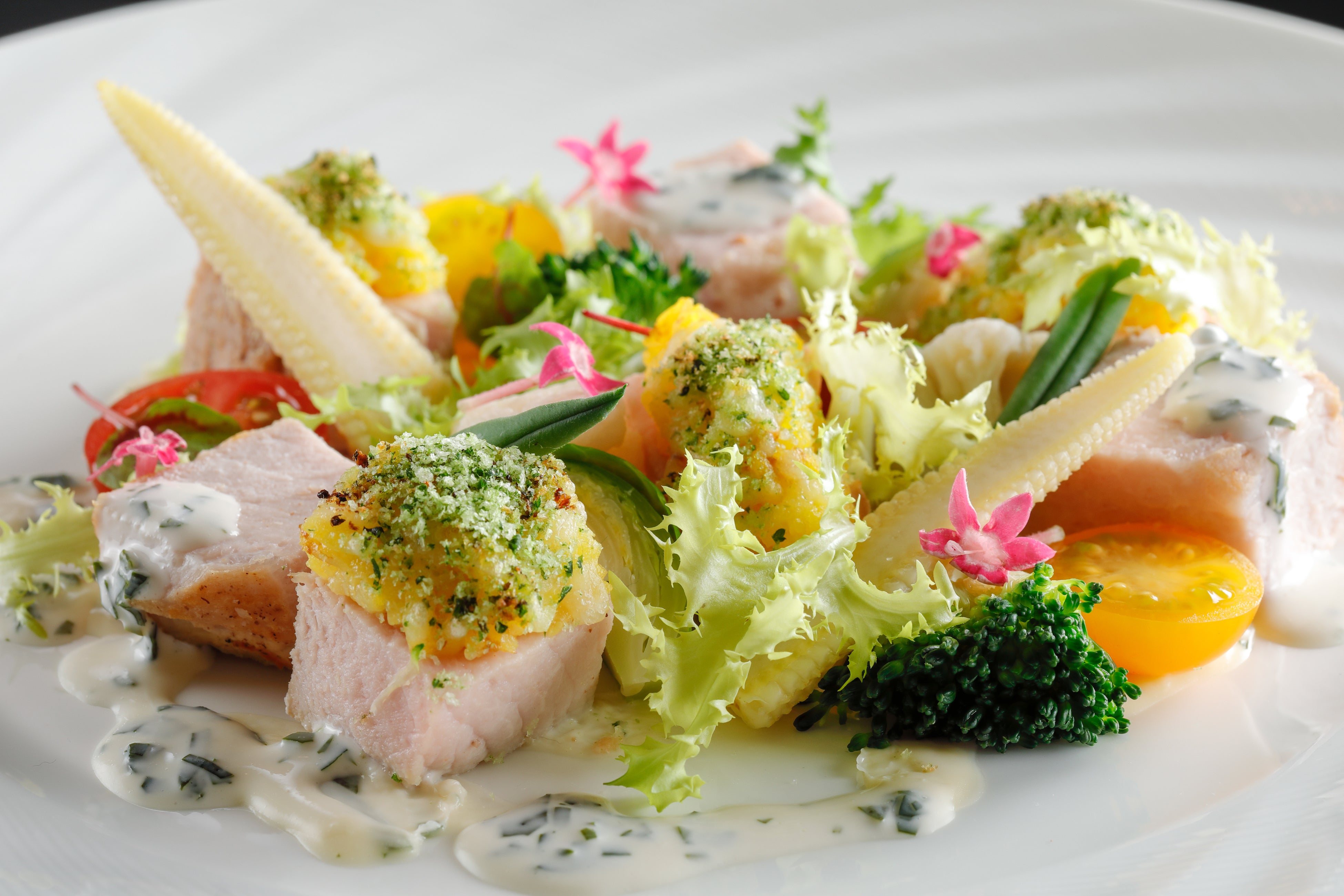 ・三重県産 豚肉のローストと伊賀米リゾットの香草パン粉焼 あおさのりとトマトのクリームソース 2,800円