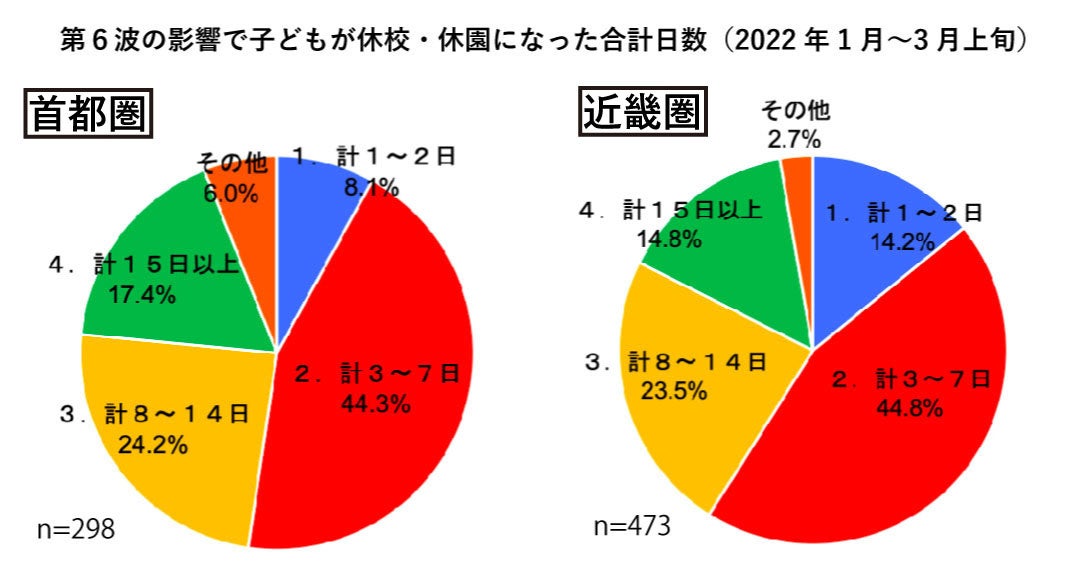 「子どもの学校・園が休校・休園になった」と回答した人に、2022年1月〜回答時(3月上旬)の間で実際に休校・休園になった日数を聞いたところ、首都圏・近畿圏ともに「計15日以上」が15%前後となりました。また「その他」の項目では「休校や休園はないがオンライン授業をしている」という方もいました。今回は「オンライン授業」が質問の選択肢になかったので、実際はもっと多くの子どもがオンライン授業を受けていると考えられますが、子どもが日中家にいなければならないという点では、オンライン授業は休校や休園と同等の影響があります。