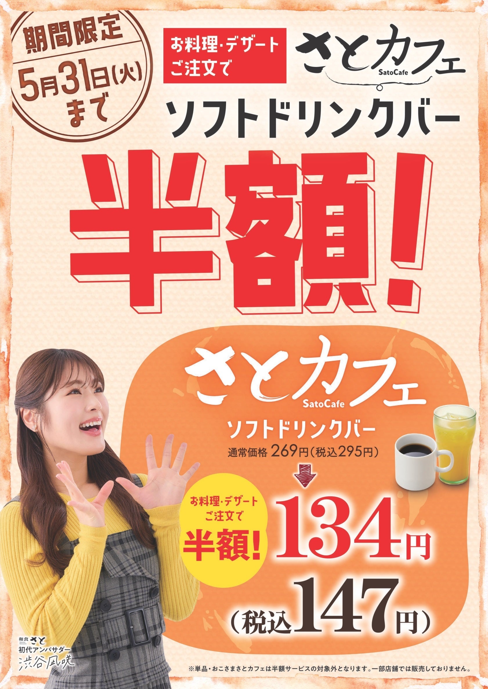国内207店舗を展開する「和食さと」では、50種類以上の組合わせが楽しめるソフトドリンクバー「さとカフェ」が、期間限定で超おトクな半額147円でご利用頂ける『さとカフェ半額キャンペーン』を、5月9日(月)から5月31日(日)まで開催します。