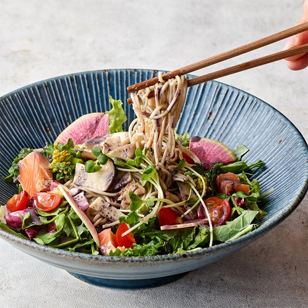 オリジナルの蕎麦つゆにアサイー・豆乳・白ごまペーストをブレンドし、まろやかでコク深いつゆに仕上げました。サニーレタス、ケール、水菜、カイワレ、クレソン、紅芯大根、菜の花、プチトマト、サーモンなど、野菜をたっぷり摂りたい方にオススメのサラダ蕎麦です。