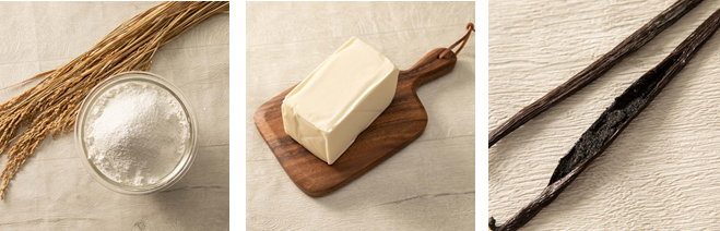 本物のフランスの味を実現するため、フランス産の小麦を使用。バターは九州の自然豊かな大地で育った乳牛から絞った生乳を使用した品質が高くコク深い南九州の高千穂バターを使い、香り付けに太陽の恵みをいっぱいに浴び自然栽培されたバニラビーンズを使用しています。無農薬・無化学肥料栽培(有機栽培認定)、肥沃な大地と熱帯雨林気候がもたらす逸品です。パプアニューギニアから取り寄せた自然のバニラの香りを楽しむことができます。