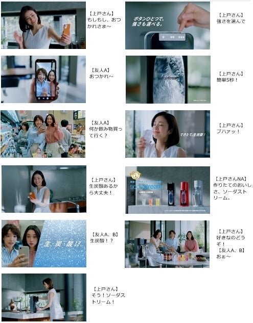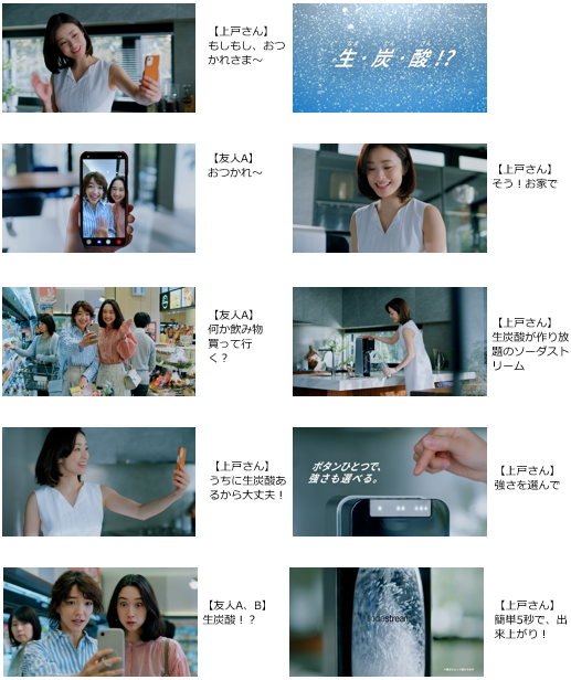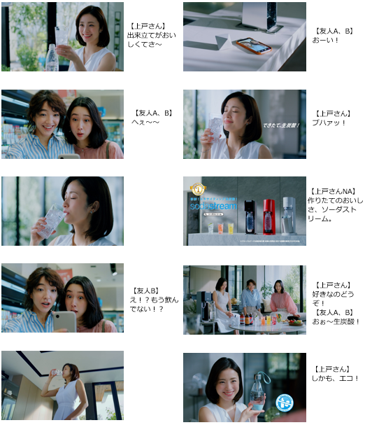 前回に引き続き女優の上戸彩さんを起用した第4弾となる今回のCMは、上戸さんが友人をホームパーティーに招き、ソーダストリームで作った生炭酸やいろんな種類のフレーバー炭酸ドリンクを振る舞う内容となっています。