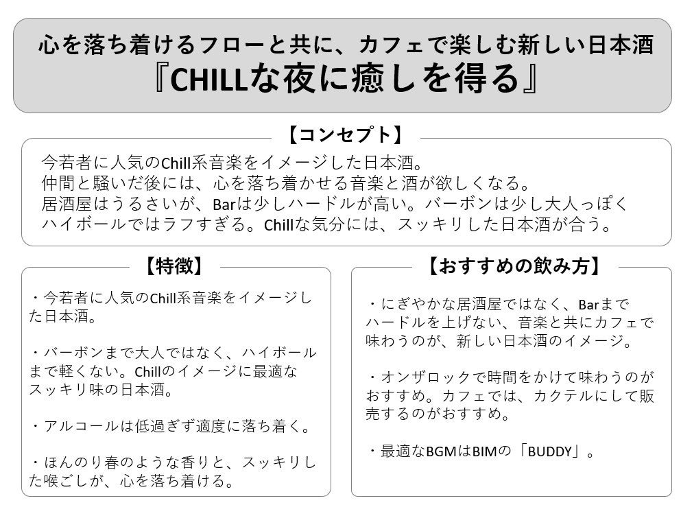 新商品「CHILLな夜に癒しを得る」は、「チルい」気分つまり「リラックスして気分がよい」時にマッチした日本酒です。