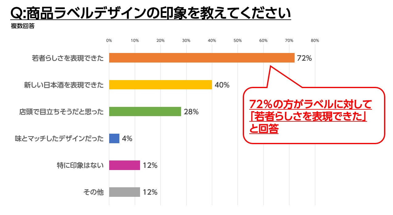 若者らしさを表現できている:72%、新しい日本酒を表現できている:40%