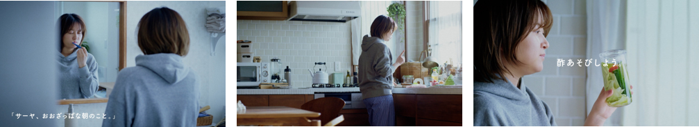 寝起きの朝に「酢あそび」するサーヤさん。様々な野菜を切るも瓶に入りきらず、そのまま生の野菜を口にするシーンでは、おおざっぱな“素”のサーヤさんを見ることができます。