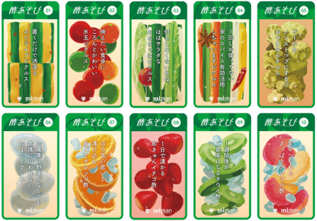 「酢あそび」を気分に合わせて楽しんでいただくため、10種の「酢あそびレシピカード」を作成し、HPにてご紹介しております。その時々の気分でレシピを選び、簡単でおしゃれな「酢あそび」をお楽しみください。