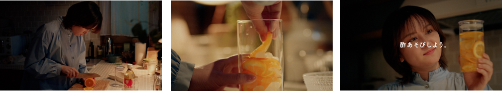 夜、家に帰ってきたサーヤさんは落ち込んだ気分でオレンジをカット。1人ほろ苦い夜を「酢あそび」で過ごします。サーヤさんが見せる「泣き姿」と“素”の表情は必見で、つい感情移入をしてしまう一面となっています。