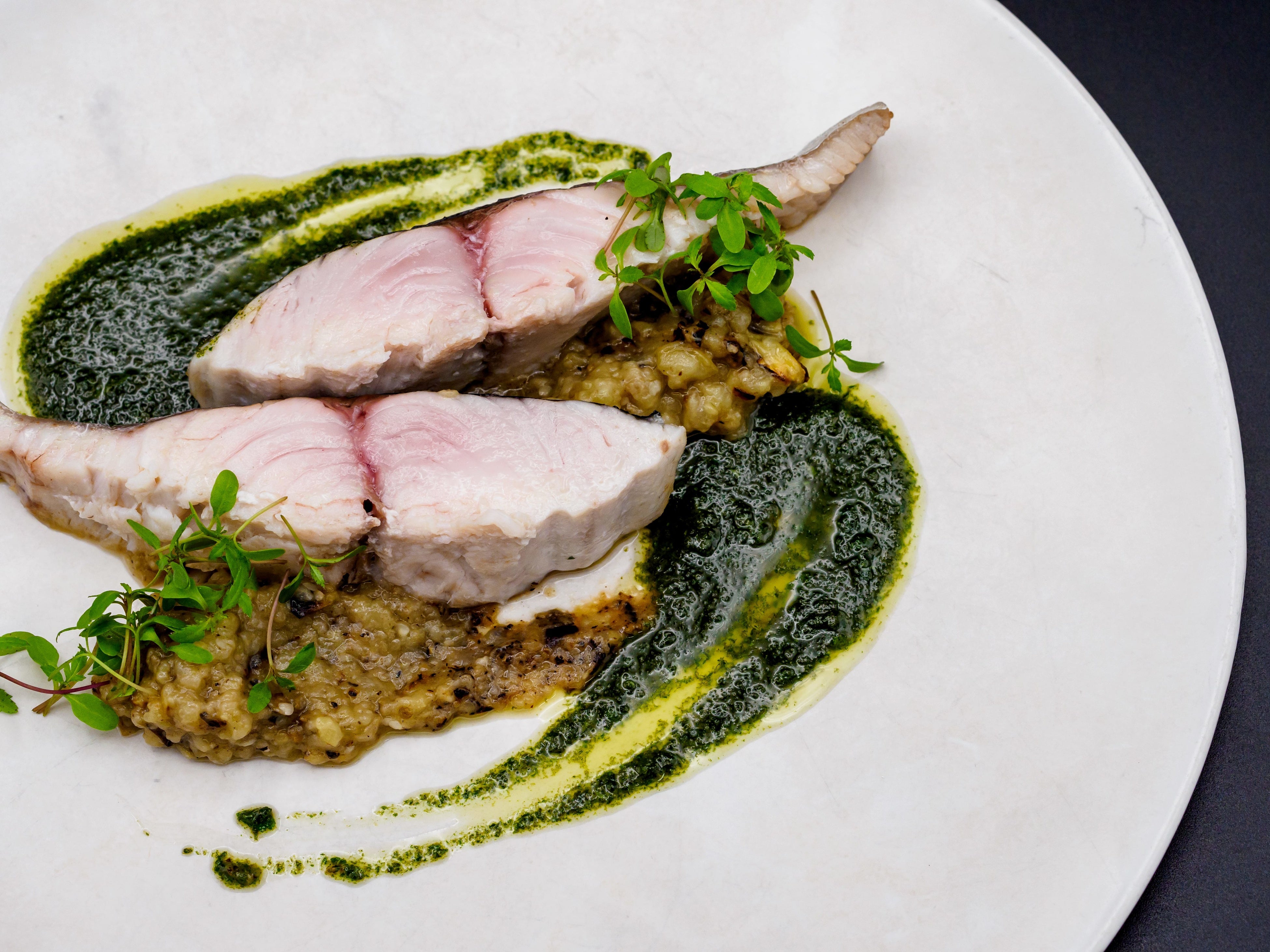 そんな鰆を皮は香ばしく、身はフワッとなるようオーブンで焼き上げ、ジェノベーゼソースと、アンチョビ風味のナスのピューレを添えました。