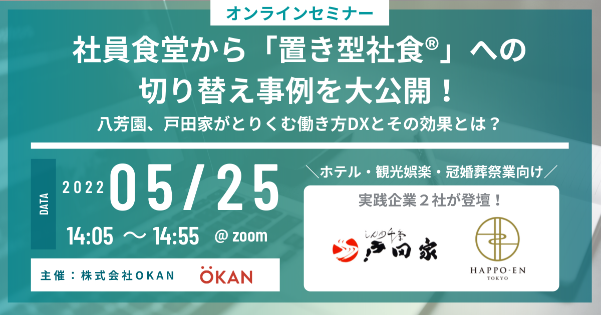 “働く⼈のライフスタイルを豊かにする”をミッション・ステートメントに、社会課題の解決に取り組む株式会社OKAN(代表取締役 CEO:沢⽊恵太 、本社:東京都豊島区)が提供する置き型社食®サービス「オフィスおかん」は、5月25日(水)14:00より、宿泊業、接客サービス業界向けオフィスおかんウェビナーを開催いたします。