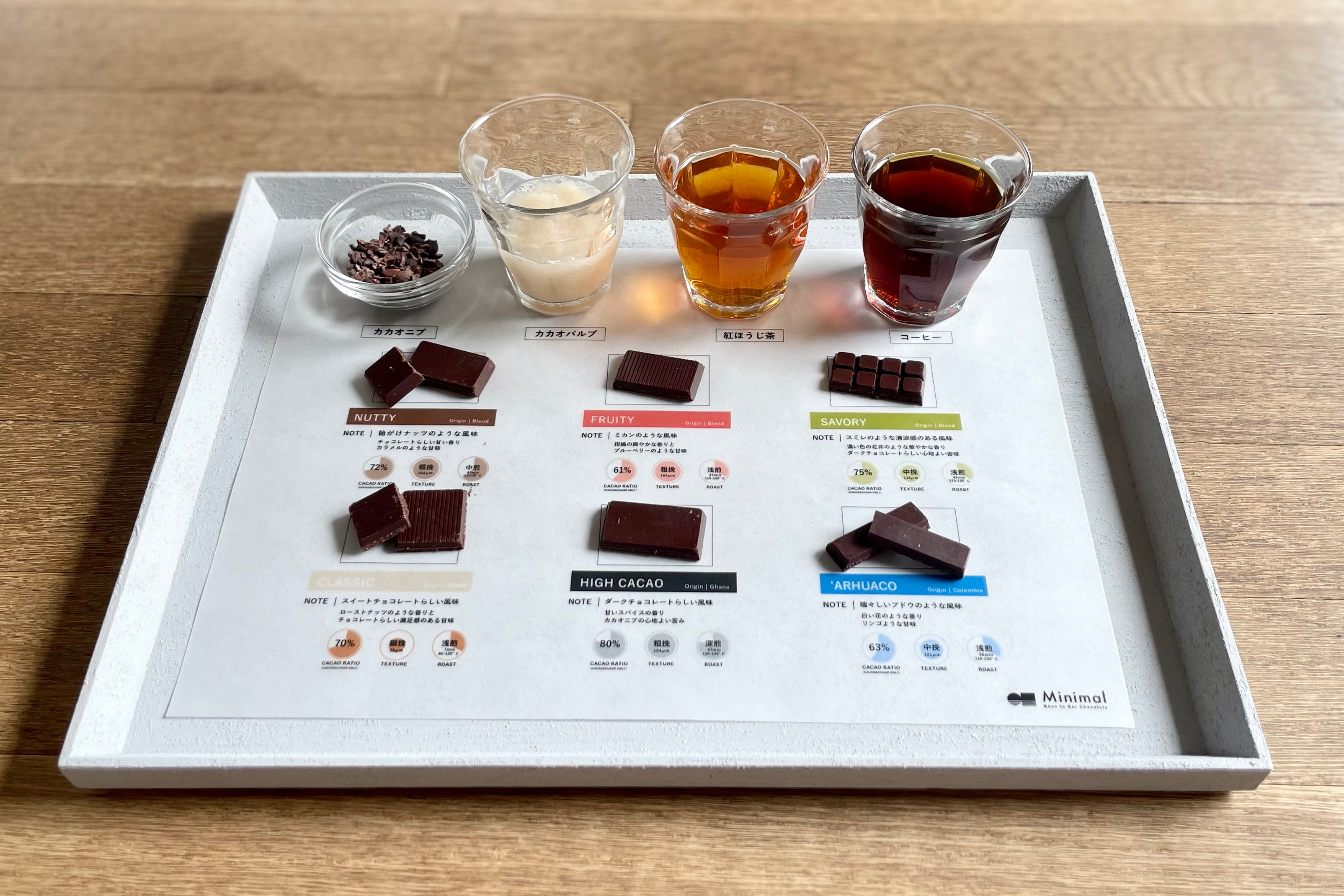 Minimalは「チョコレートを新しくする」をテーマにカカオ豆からチョコレートの体験をより楽しく豊かにする事にこだわりサービスをご提供しています。本セットは、カカオとチョコレートを取り巻くこれまでにない新しい食体験をご堪能いただけます。