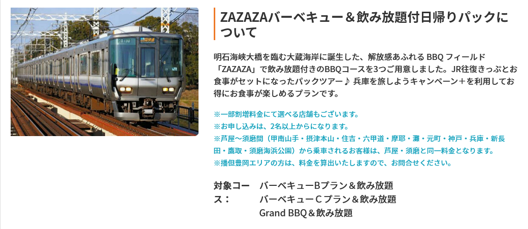 株式会社フォーティーズ(本社:大阪市鶴見区、代表取締役 岡武史)は「ふるさと応援!ひょうごを旅しようキャンペーン」の対象商品として「「ZAZAZA」で飲み放題付きのBBQコースを3つご用意しました。JR往復きっぷとお食事がセットになったパックツアー♪ のオンライン販売を開始しました
