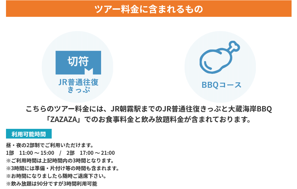 こちらのツアー料金には、JR朝霧駅までのJR普通往復きっぷと大蔵海岸BBQ「ZAZAZA」でのお食事料金と飲み放題料金が含まれております。
