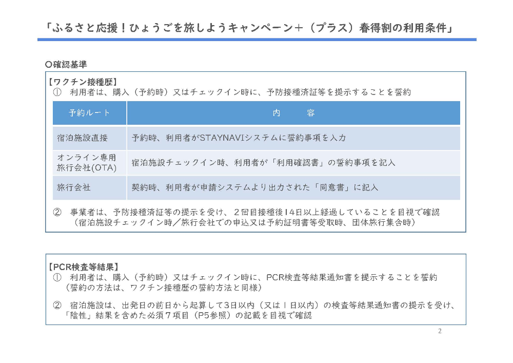 接種済証またはPCR検査等結果通知書(撮影画像、コピー、電子的な証明書でも可)の確認は、同行者も含めて旅行者全員について実施しますので、チェックイン時(旅行会社の場合は予約証明書等お渡しの来店時)にご提示ください。提示のない場合は割引支援を受けることができません。