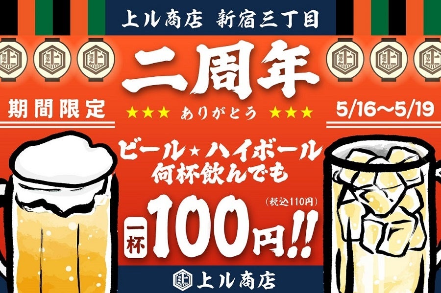 ヘルシーな天ぷらと本格抹茶割りでアガル店『天ぷら酒場 上ル商店 新宿三丁目店』(運営:株式会社TBI JAPAN、本社:東京都新宿区、代表取締役社長 後藤 浩之)は、<オープン2周年>を記念して、2022年5月16日(月)~19日(木)の期間限定で、【ビール、ハイボールが何杯飲んでも1杯100円(税込110円)】となるキャンペーンを実施いたします。
