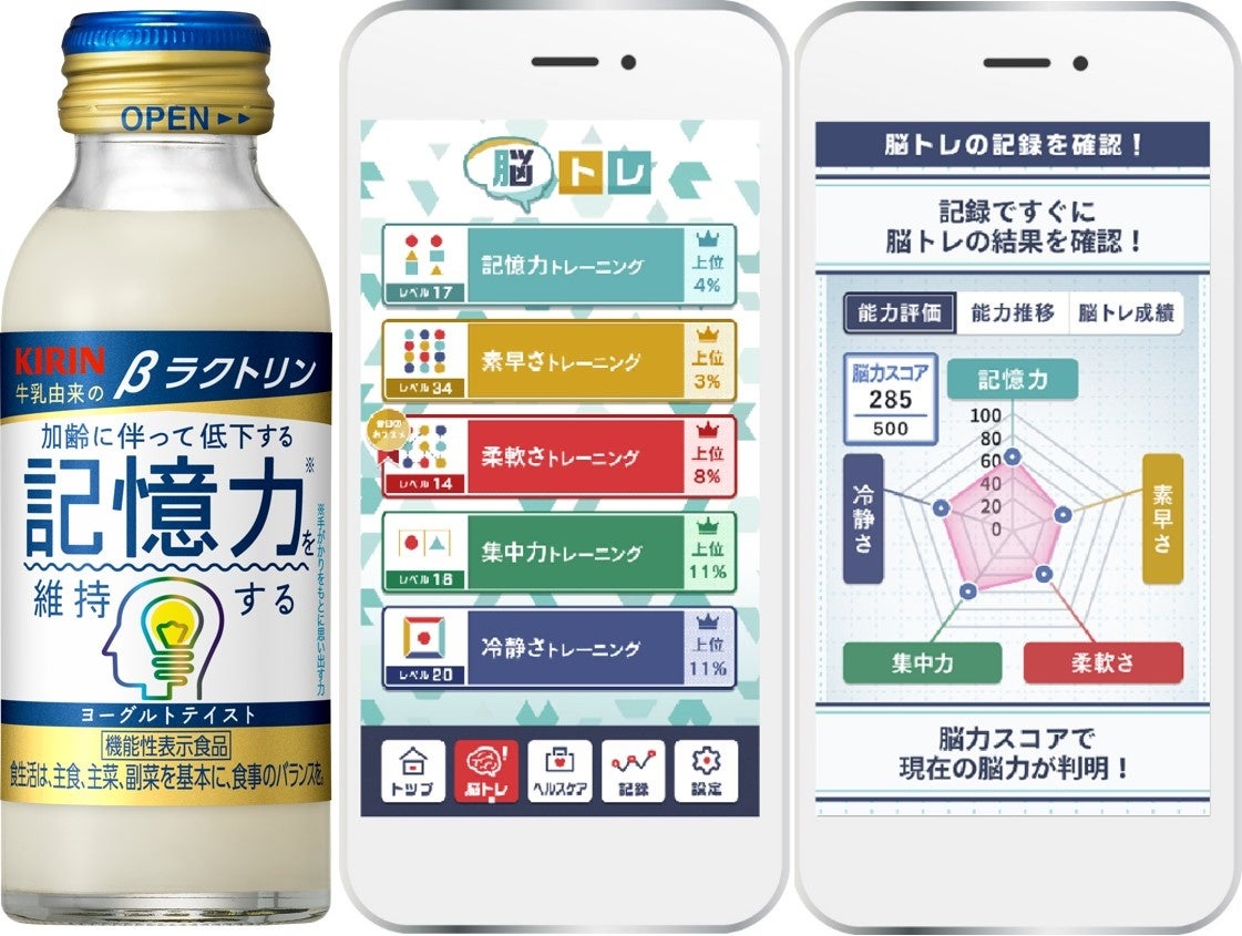 加齢に伴って低下する“記憶力※1の維持”が報告されている乳由来ペプチド「βラクトリン」配合の機能性表示食品「キリン βラクトリン」と、脳トレアプリ「KIRIN 毎日続ける脳力トレーニング」を組み合わせた、「キリン脳研究」の取り組みです。楽しく継続できる、脳の健康習慣を提案します。