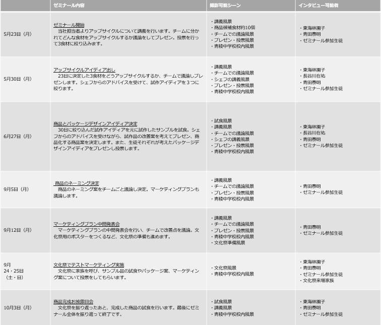 生徒はゼミナールで、5月はアップサイクルについて学んだあと、商品開発に向けてアップサイクルをする食材とその活用方法を考えます。6月に食材と商品パッケージ案のコンテストを行い、夏休みの課題を挟んで9月には商品のネーミングを決定します。それ以降は文化祭で家族に商品サンプルを食べてもらって感想を聞くなど、10月の販売開始に向けてマーケティングプランを練り上げていく予定です。