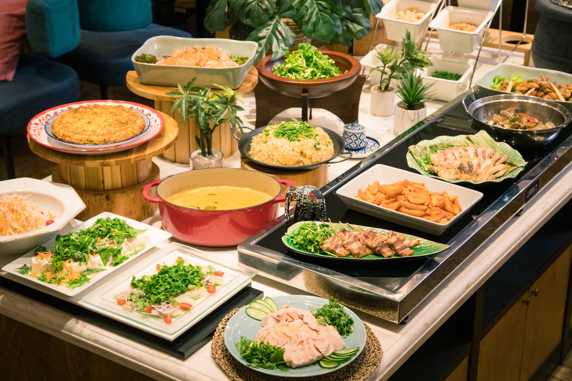 当店でも人気のトムヤムクンに加えてカオソーイの2種類のスープと2種類の米麺(フォー、タイビーフン)を組み合わせる事で、身体にも優しい仕上がりの商品となっております。全33種のタイ料理から日毎に23種が楽しめるお食事と全日日替わりで替わるデトックスウォーター+アジアンハーブティー(ICE&HOT)が飲み放題付のタイランチビュッフェを存分お楽しみください。