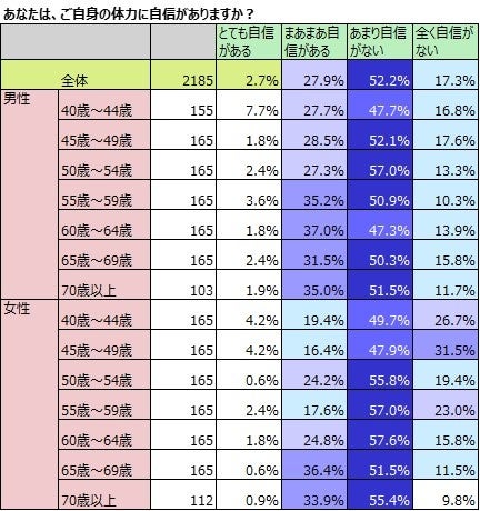 当社が3月7日から13日に行った調査(インターネット調査 n=2,185 40歳~70歳以上 男性:1,083名 女性:1,102名)では、40歳以上の男女のうち、コロナ禍で「散歩などの外出や、身体を動かすことが減った」と答えている人が、62.1%(とても減った 24.0%/まあまあ減った 38.1%)で、6割を超えています。また、「健康に自信がありますか」という質問では、「自信がない」と答えた人が、63.4%(全く自信がない 13.3% あまり自信がない 50.1%)と、こちらも6割を超える人が「自信がない」と答えています。また、「体力に自信がありますか」という質問には、「自信がない」と答えた人が69.5%(全く自信がない 17.3% あまり自信がない 52.2%)で、約7割の人が、体力に自信がないようです。(詳細は、4月7日発表 ニュースリリースタイトル「コロナ禍で『対面の会話が減った』中高年、8割超」。)特に40代女性は、「健康に全く自信がない」とこたえているのも、「体力に全く自信がない」と答えているのも、2割を超え、他の年齢層よりも群を抜いています。