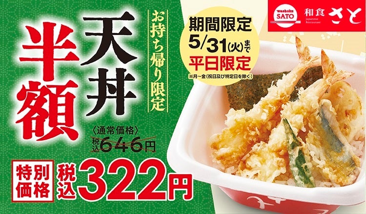 国内207店舗を展開する「和食さと」では、平日限定の超お得なキャンペーンとして、5月31日(火)までテイクアウト天丼を、半額の322円で販売します。