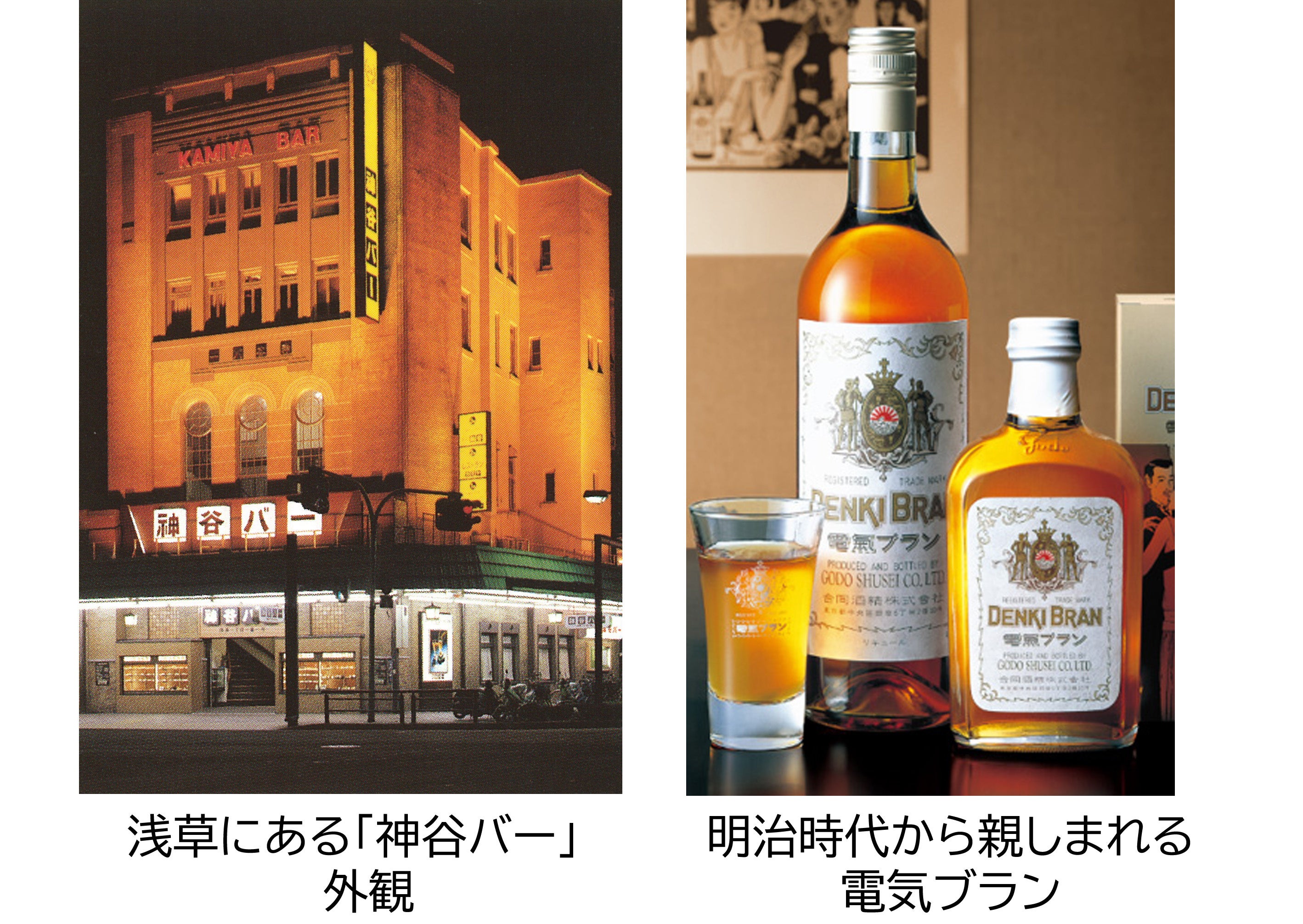 同店は、同社と創業者(神谷傳兵衛(かみやでんべえ))を同じくし、1880(明治13)年に日本初のバーとして誕生、140年以上にわたって浅草で親しまれてきました。飲食店としてはもちろん、観光スポットとしても人気があり、2011(平成23)年に登録有形文化財に登録され、今も昔も浅草を代表する場所の1つです。ビールをチェイサー代わりに、良く冷やした「電気ブラン」をストレートで楽しむ飲み方が、同店では広く知られており、粋なものとされています。