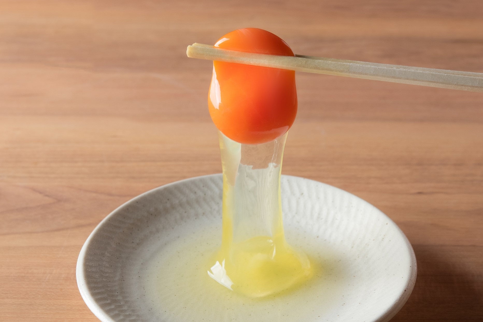 植物性たんぱく質を摂るように配合した餌を食べるため、生臭さやクセのない味わいに整います。割箸で黄身を持ち上げても破れないコシや粘度は、餌や飼育環境などのこだわりとコストに捉われず良い卵を作ろうとする生産者の努力によるものです。