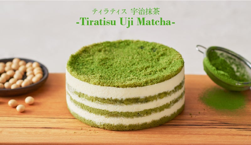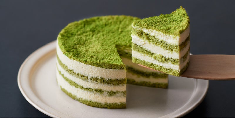 抹茶のジェノワーズ層とソイマスカルポーネムース層を6層に重ね、色鮮やかな宇治抹茶クラムで仕上げています。