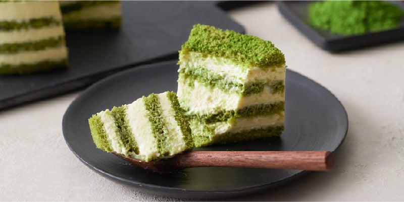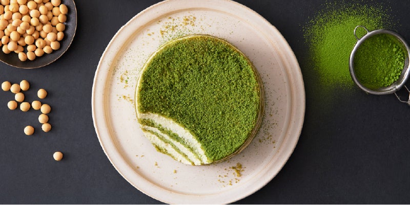 抹茶のジェノワーズ層とソイマスカルポーネムース層を6層に重ね、色鮮やかな宇治抹茶クラムで仕上げています。