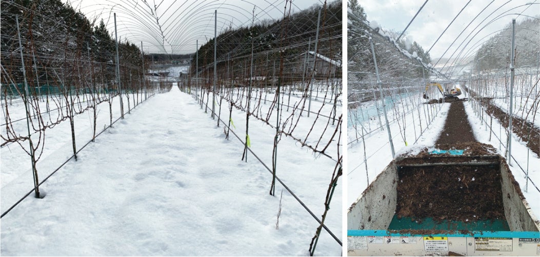そこそこの降雪があり、しっかりとぶどうの樹も休眠できる冬でした。ぶどうが一年頑張ってくれたお礼としてバーク堆肥を畑に散布し土づくりを行います。剪定作業を行い剪定した枝は品種、クローンごとにまとめ、接木に使用するまでおが屑、籾殻の中で保管します。