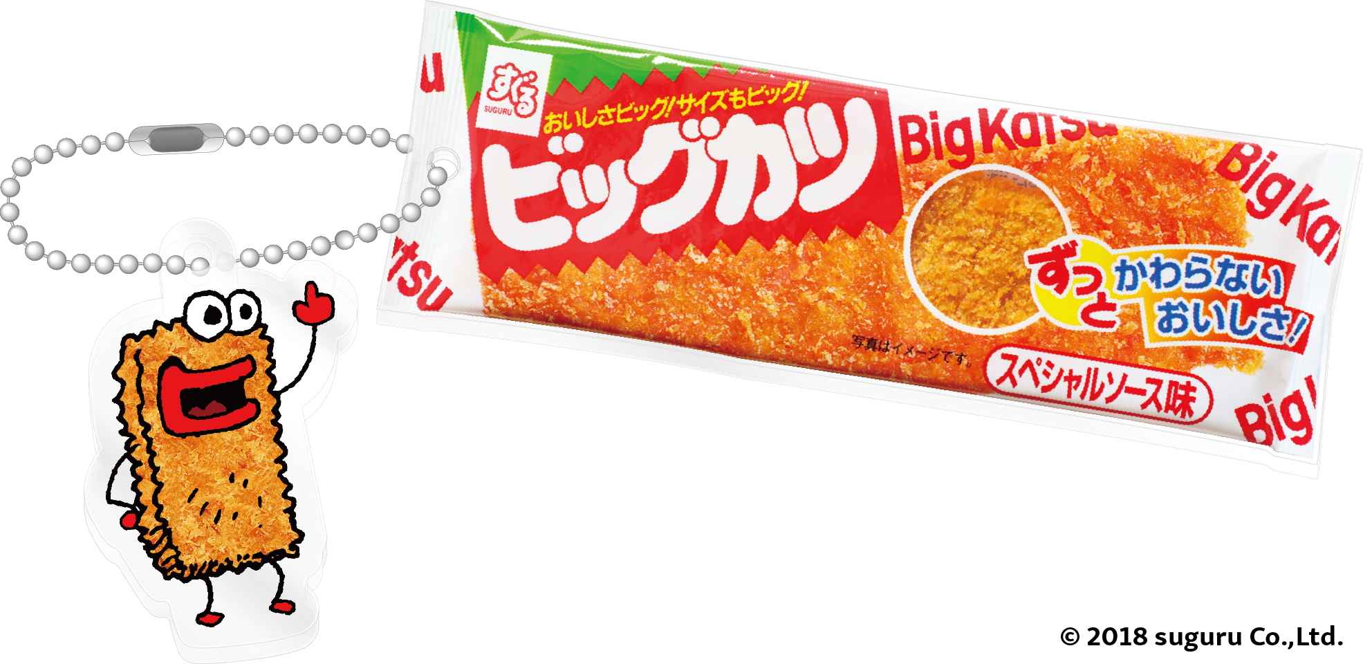 ビッグカツの実物画像を使用した、ビッグカツ約1/2サイズのアクリルプレートと、小さなビッグカツくんがセットになったキーホルダーです。本物のビッグカツに見えるようにアクリルの形にもこだわっております。