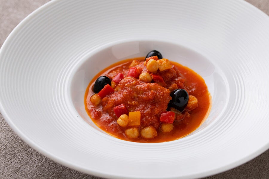 厳選した国産の鶏もも肉を皮目がパリっと焼色がつくまでソテしてから、トマトソースで軽く煮込みます。トマトソースにはパプリカとひよこ豆、オリーヴに加え、旨みとコクを出すイベリコ豚のベーコンと、隠し味にナンプラーを使用しました。