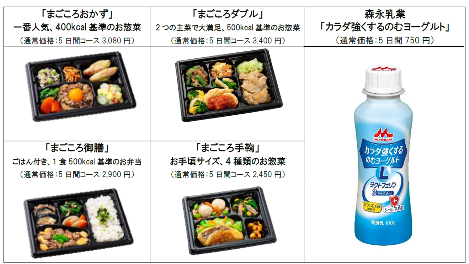 4種類のお弁当・お惣菜を平日20日間分と「からだ強くするのむヨーグルト」20本をお試しいただきながら、自分の好みやライフスタイルに合った商品を見つけていただき、継続してご利用いただくことで、健康的な食生活をサポートしていきたいと考えております。