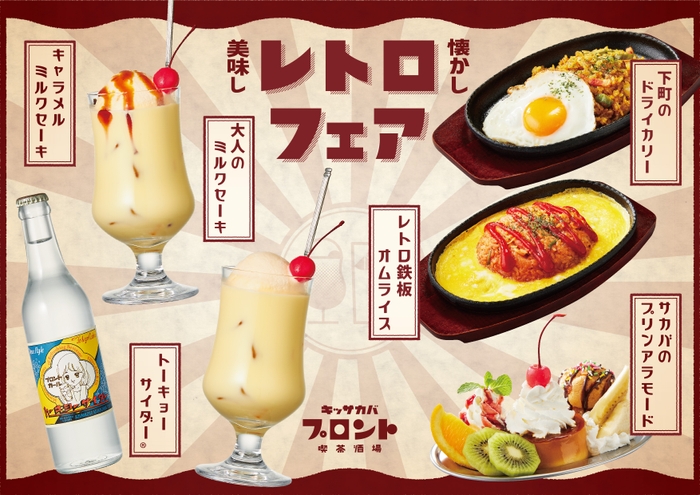 「レトロフェア」の期間中、キッサカバらしいワクワク感溢れる酒場アレンジの「サカバのプリンアラモード」「下町のドライカリー」「レトロ鉄板オムライス」など、 レトロ感満載の限定メニューが登場します。中でもイチオシはプロントオリジナルラベルの「トーキョーサイダー」を使用し、翠ジンベースで特徴のある味わいに仕上げた「トーキョーサイダーサワー」。 ナカ(翠ジン)とソト(トーキョーサイダー)のセットで提供するので、お好みの濃さに割ってお楽しみください。 ナカもソトも追加オーダーでき、また、ソトのみのご注文で「トーキョーサイダー」をそのままお楽しみいただくことも可能です。店内のテーブルメニューには各々の歴史を掲載。食べても飲んでも読んでも楽しい、レトロを満喫できる「レトロフェア」です。