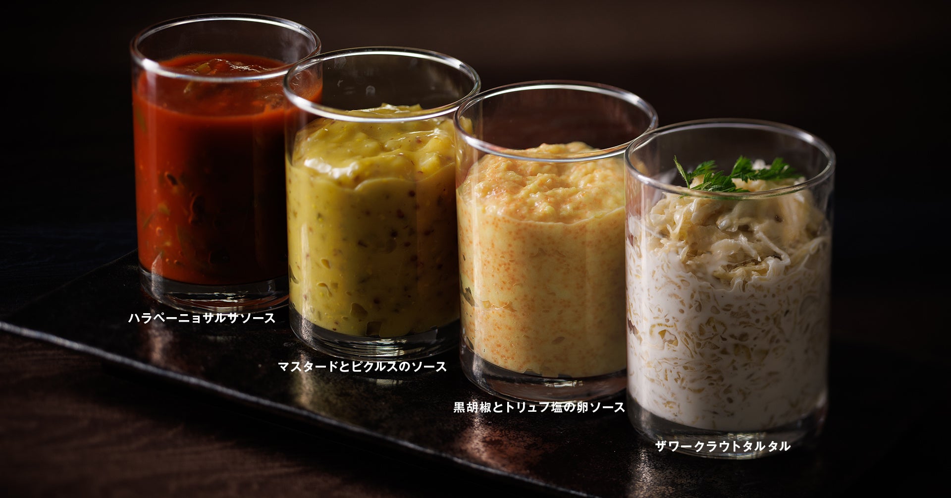 さらにおいしく食べるための味変ソース(ハラペーニョサルサソース・マスタードとピクルスのソース・黒胡椒とトリュフ塩の卵ソース・ザワークラフトタルタル)もご用意しました。