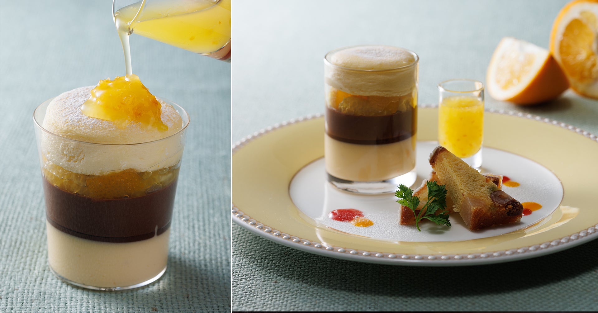 ふわふわのチーズスフレに、濃厚なチョコレートプディングとキャラメルソース、旬の甘夏のコンポートとマスカルポーネのムースを重ねました。