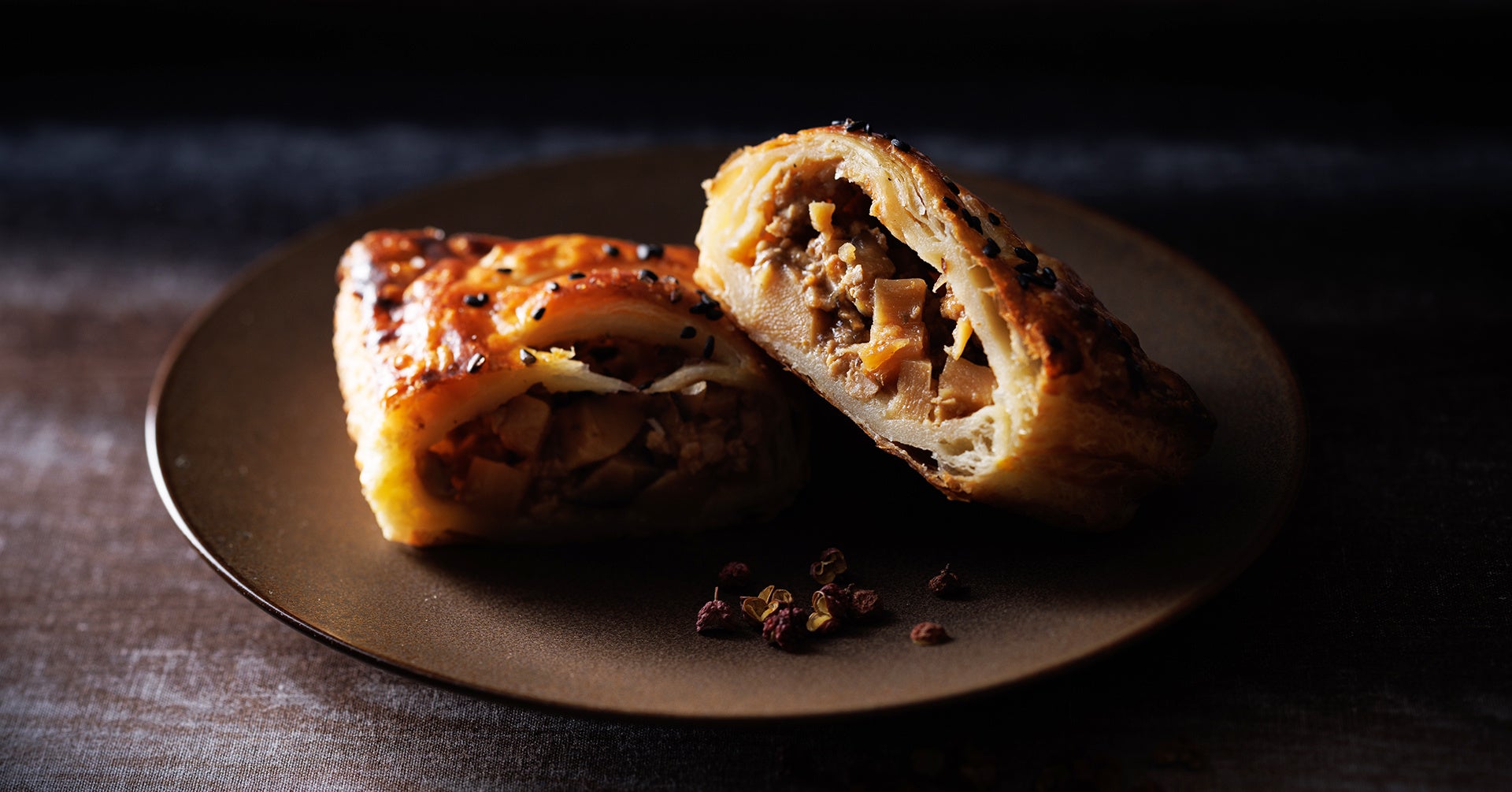 山椒の香りがピリッと爽やかに効いた、中華まんのような味わいのミートパイです。