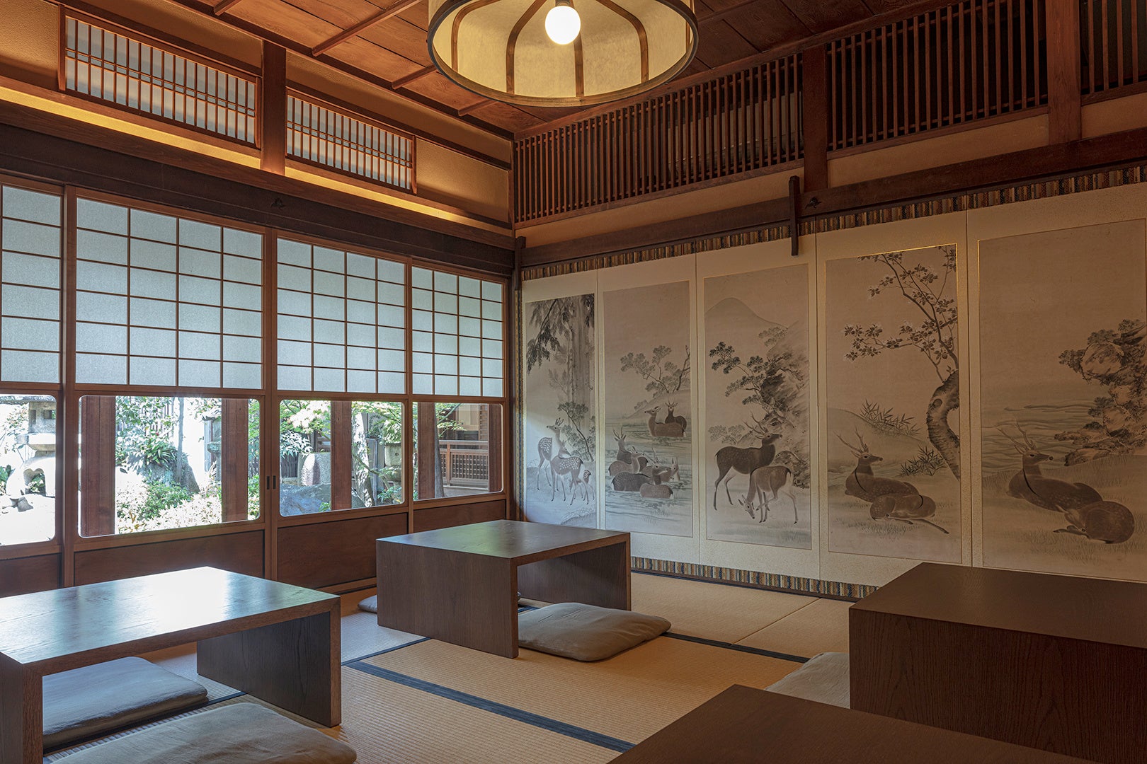 江戸時代から続く中庭が一望できる店内で、かき氷をお召し上がりいただけます。座敷に広がる鹿が描かれた大きな屏風は、興福寺に仕えていた絵師・内藤其淵(ないとうきえん) による江戸後期のもの。鹿を描かせたら右に出るものなしと言われた名手です。
