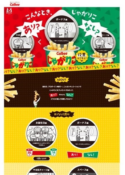 「こんなとき、じゃがりこあり?なし?」と題して、「誕生日にじゃがりこタワー あり?なし?」「ボーナスがじゃがりこ あり?なし?」など、「じゃがりこ」を人にあげるのにちょうどよい場面を、お客様と一緒に楽しみながら探る企画を実施いたします。