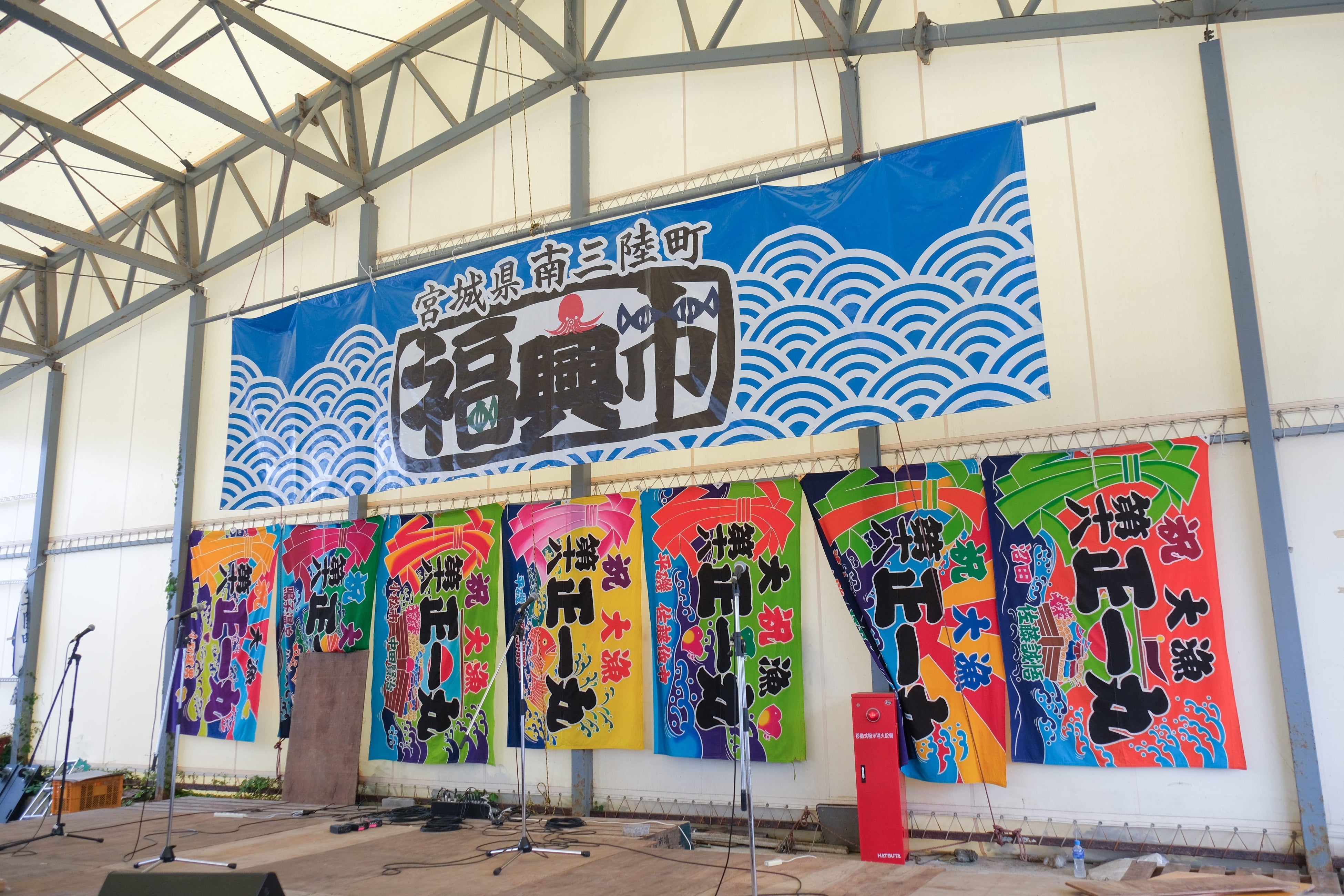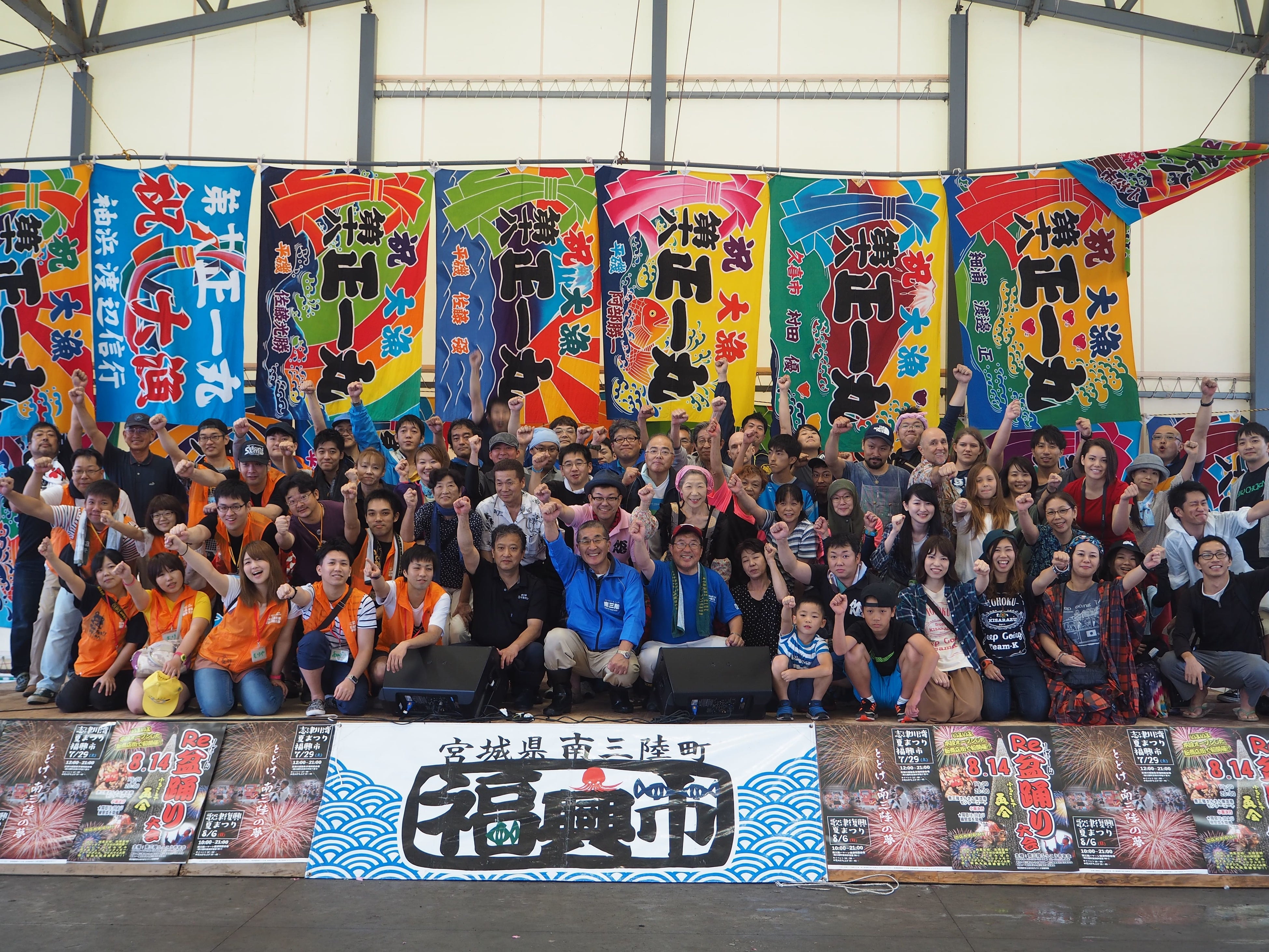 震災前、南三陸町の中心市街地には数多くの商店が軒を連ねていましたが、東日本大震災によりその大半が流失しました。人・自然・食、そして古くから伝わる伝統文化を軸とした、観光によるまちづくりを推進してきた南三陸町にとって、水産業や商工業の復活は、町そのものの復興の基盤となるものでした。福興市は、商店の店主らと地域住民有志、町内外の各団体が協働し、毎月一回、改めて地域産業のネットワークを密接にし、南三陸町の復興の土台を整えることを目的に開催してきました。