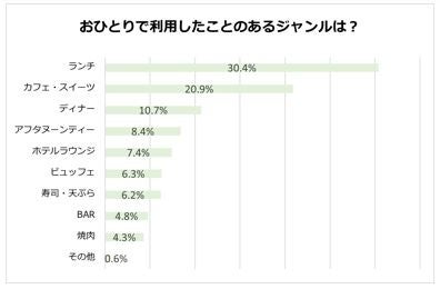 A:1位ランチ30.4%、2位カフェ・スイーツ20.9%、3位ディナー10.7%、4位アフタヌーンティー8.4%、5位ホテルラウンジ7.4%、6位ビュッフェ6.3%、7位寿司・天ぷら6.2%、8位BAR4.8%、9位焼肉4.3%、10位その他0.6%(ラーメン・蕎麦・居酒屋・朝食など)