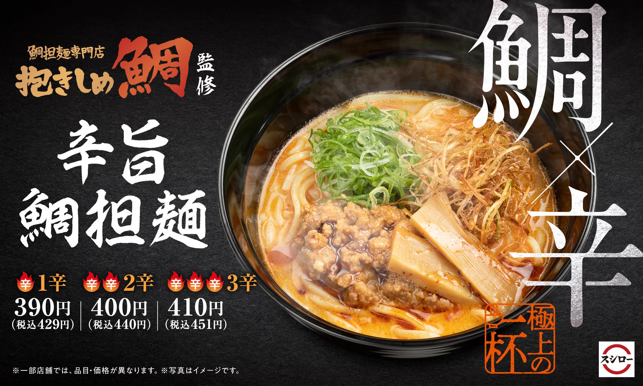 大阪の人気店 鯛担麺専門店「抱きしめ鯛」監修、“鯛の旨み×辛旨担々スープ”が特長の「辛旨 鯛担麺」を、全国のスシローで、ぜひこの機会にお召し上がりください。