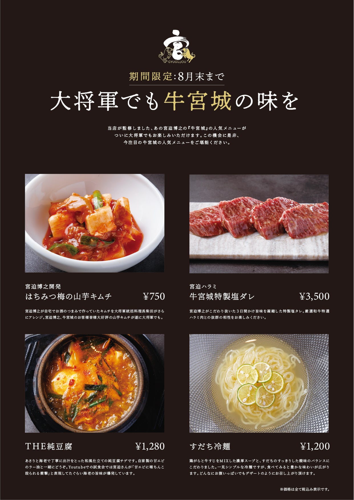渋谷にある「牛宮城」の味を、「株式会社ガネーシャ」の故郷である富山県の皆さまにも味わっていただきたいという想いから、今回は富山県内にある「焼肉ハウス大将軍 大泉店」「焼肉ハウス大将軍 駅前店」「焼肉ハウス大将軍 桜木町店」「韓国豚焼肉専門店 BUTAMAJIN」「将軍ホルモン」の5店舗にて、「牛宮城」メニューの一部を、2022年5月13日~8月末日までの期間限定でご提供致します。