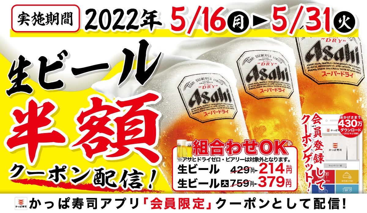 コロワイドグループのかっぱ寿司(カッパ・クリエイト㈱ 本社:神奈川県横浜市)は、2022年5月16日(月)~5月31日(火)の期間、かっぱ寿司で使用できる「生ビール半額クーポン」をかっぱ寿司アプリ会員に配信いたします。